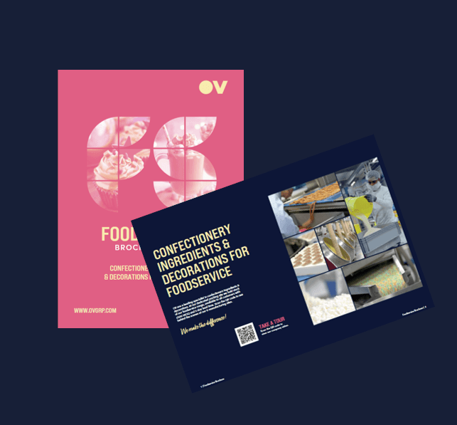 The brochure showcases OV’s wide range of confectionery ingredients and decorations, including fudge, sprinkles, inclusions and marshmallows. It highlights how OV supports retail, food service and industrial manufacturers with innovative solutions, expert support and high production standards.