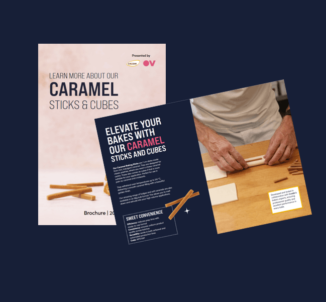 The brochure presents OV Group’s Caramel Sticks and Cubes, designed for pastries like croissants and pain au caramel. It highlights their rich flavour, baking stability and convenience, while also showcasing co-creation opportunities and professional recipes developed with Credin’s bakery experts.