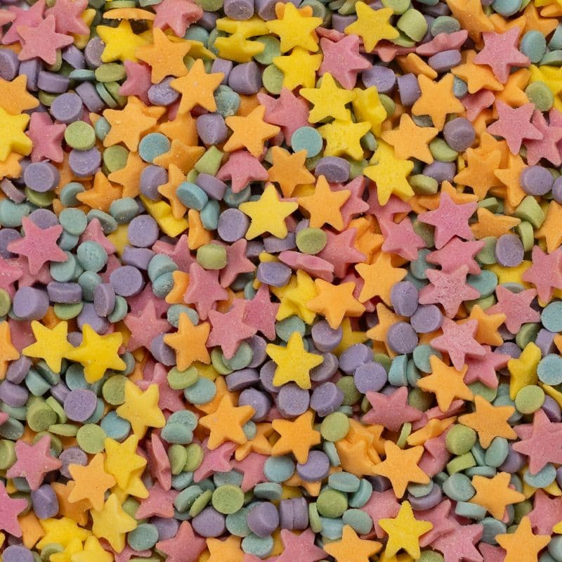 Multicoloured stars and confetti dots sugar shapes. Please note that the MOQ can vary for market to market, please contact your local OV representative for details.